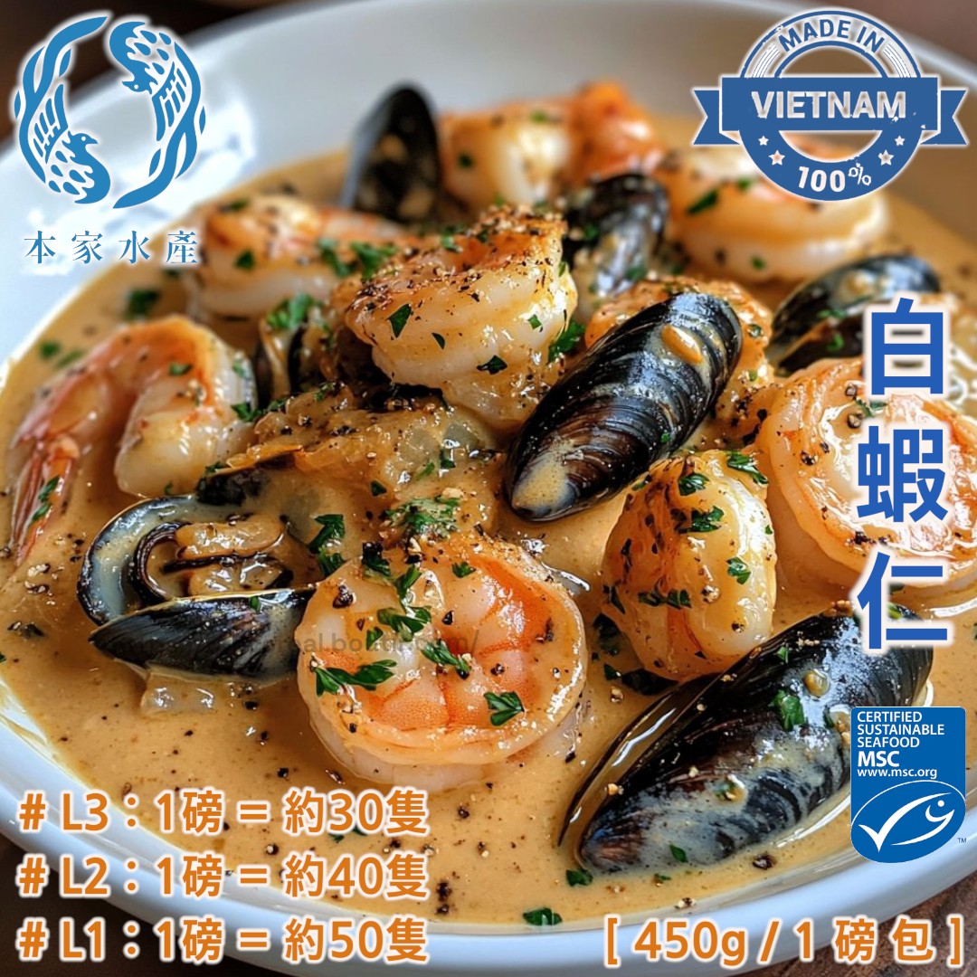 越南 ▪︎ 直送 ▪︎ 白蝦仁 [ 3L / 2L / 1L : 450g : 1 磅/包 ] 超級新鮮直送 “ 越南白蝦仁 “,唔好睇佢簡簡單單蝦仁咁簡單,點樣揀最好嘅蝦仁原來當中都有好多奧妙,蝦仁起蝦苗長大至中size [L1] 期間蝦肉呈橙色味到偏淡但爽身,當蝦成長至大size [L2 +] 就會開始呈藍色 [越大越深色越甜] 。 點解有時喺超市買到嘅細蝦仁都會呈藍色好可能係養殖藥水用得太多甚至加咗食用色素養殖,不幸買咗煮完出嚟蝦肉會梅同冇味。 店長好友,係某間酒店中菜總廚。有幸得佢指導同大家分享一下心得,點先可以在家煮到又白又令又爽又鮮味嘅烹調秘訣!!!! 首先,蝦仁解凍後用廚房紙索乾,用適量:鹽,糖,白胡椒,麻油,”蛋白” 醃15至20分鐘。煮之前加丁屎咁多蠔油撈勻,咁樣煮出嚟色澤光鮮,鮮味又爽身。 店長試咗啦,真係work大家不妨試一試。 3L : 450g : 1 磅/包 約30隻 2L : 450g : 1 磅/包 約40隻 1L : 450g : 1 磅/包 約50隻